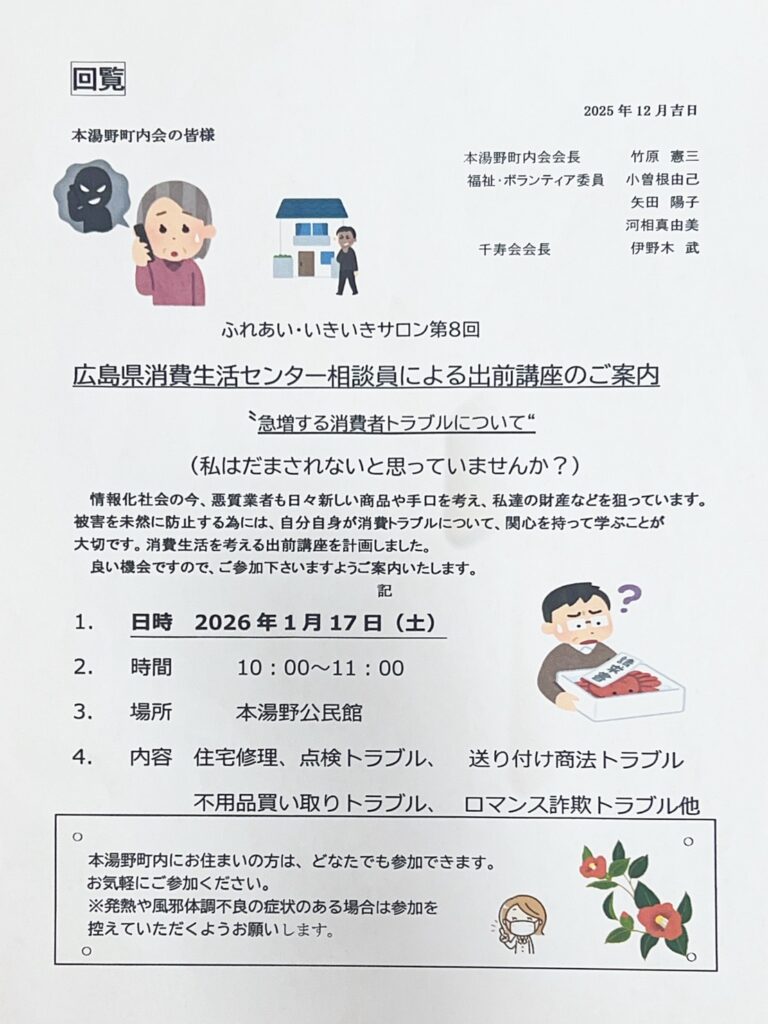 本湯野町内会 出前講座 急増する消費者トラブルについて 2026年1月22日 最終更新日時 : 2026年1月21日 yuda-kanri001 広島県消費生活センター相談員による出前講座を実施。無料点検、無料住宅修理、不用品買い取り、送り付け商品トラブル等、悪質業者から私達の未然防止方法や対応方法等学びました。参加者35名でした。