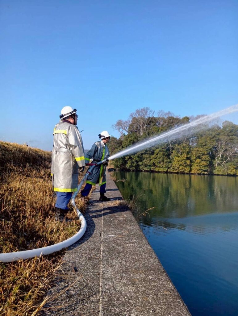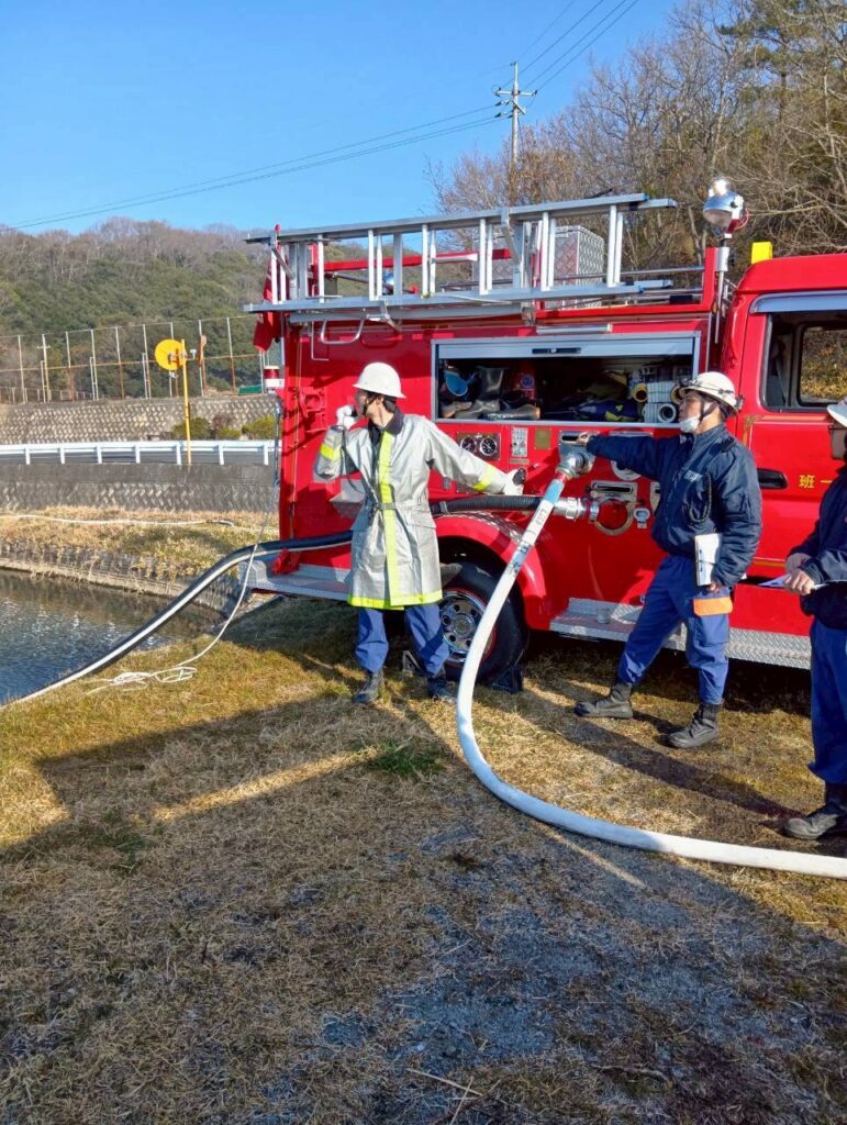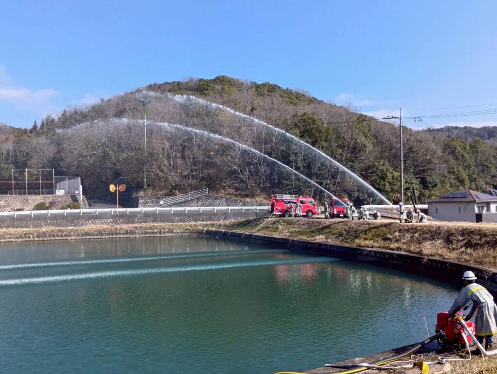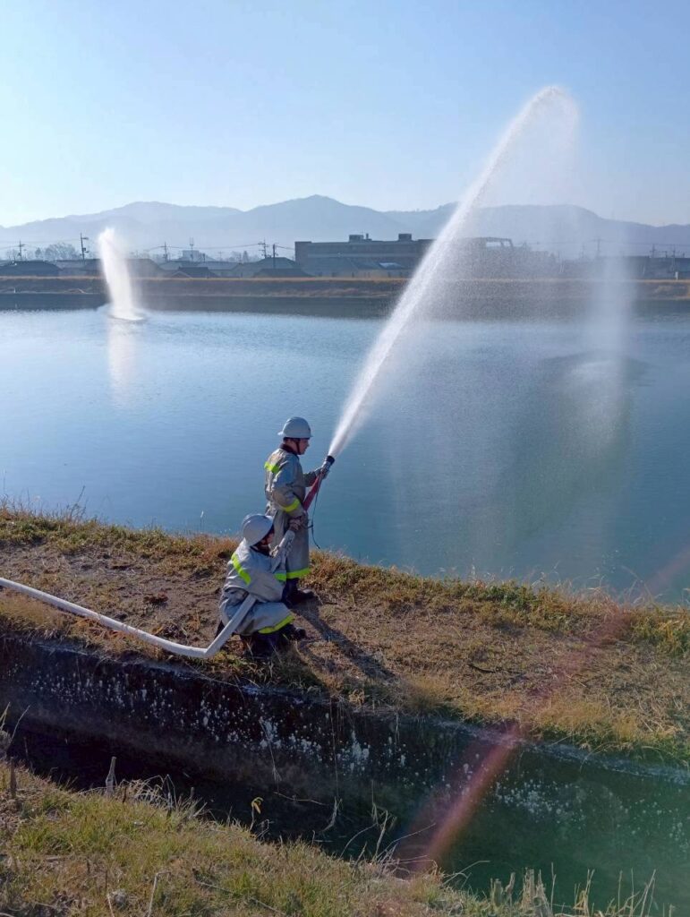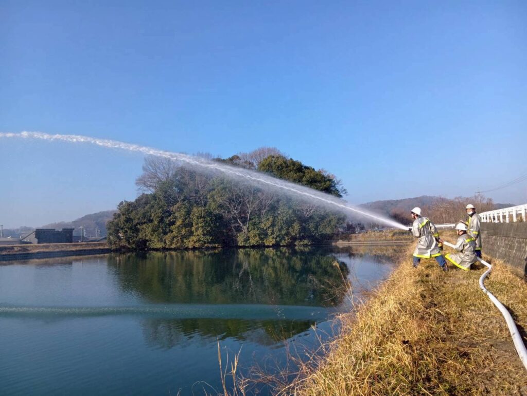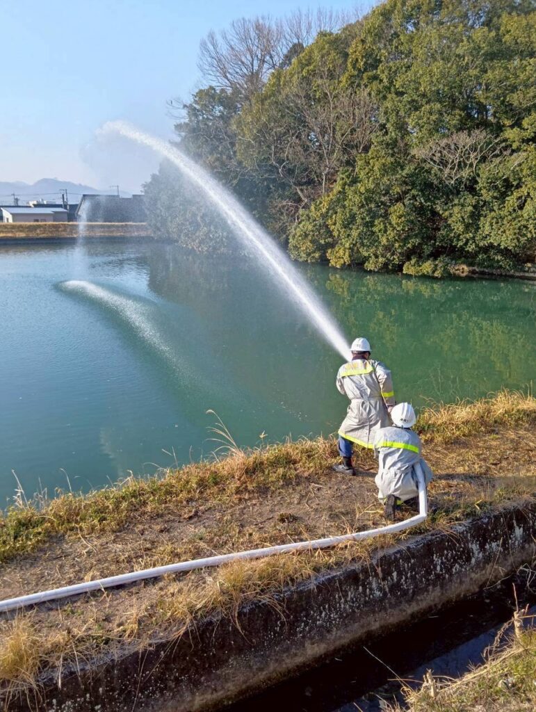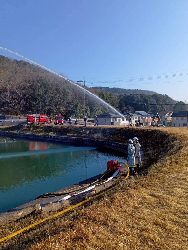 2月22日(日)8時から福田池(神辺町湯野)で放水訓練を実施しました。