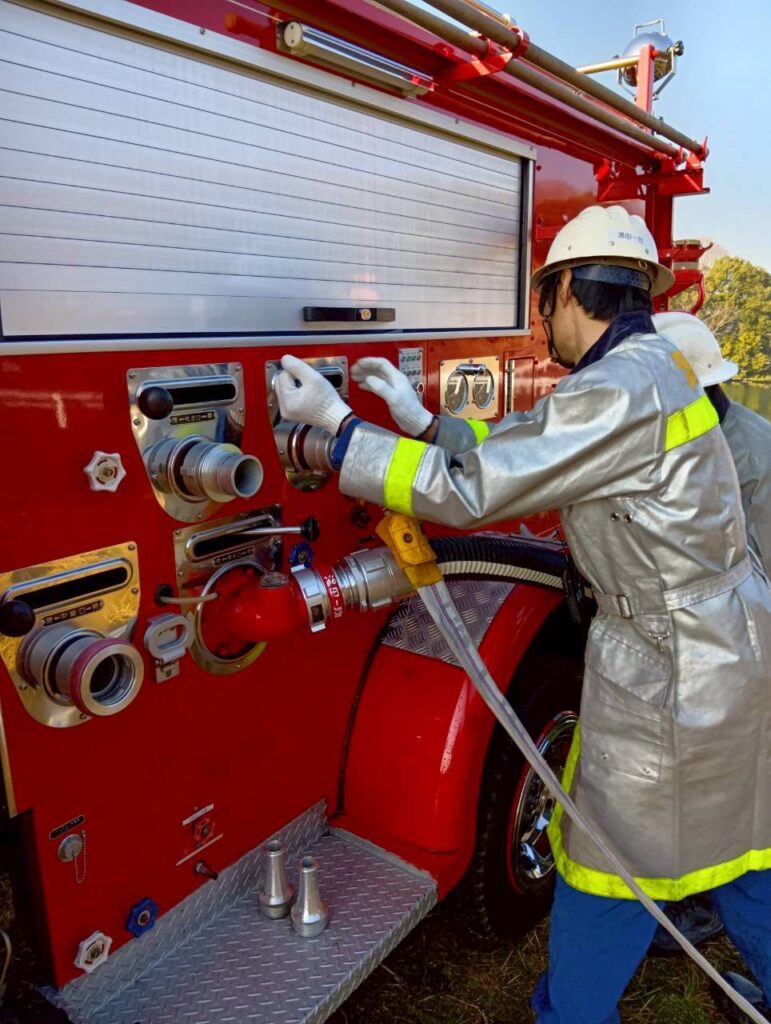 湯田1班、2班それぞれが器具庫から出動し、現場到着後ホースを伸ばす、放水し消火・火災を防御する、鎮火後の残火対応、器具の撤収などの一連の動きや手順の確認を行いました。素早く活動展開すること、無線での情報共有、指示、報告などの連携する観点でも向上を図り、災害時に迅速に安全に活動していくための行動について検証する良い機会となりました。